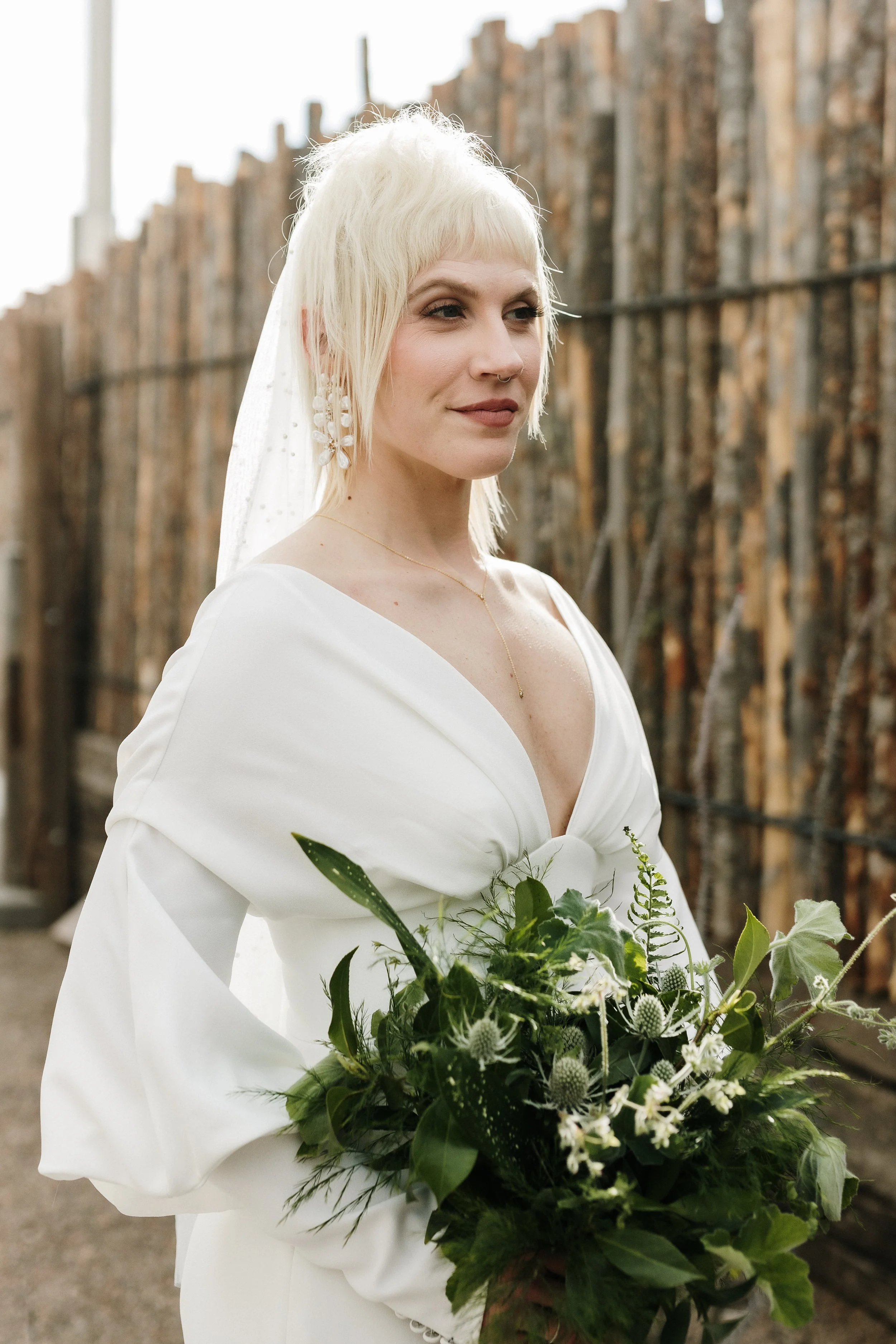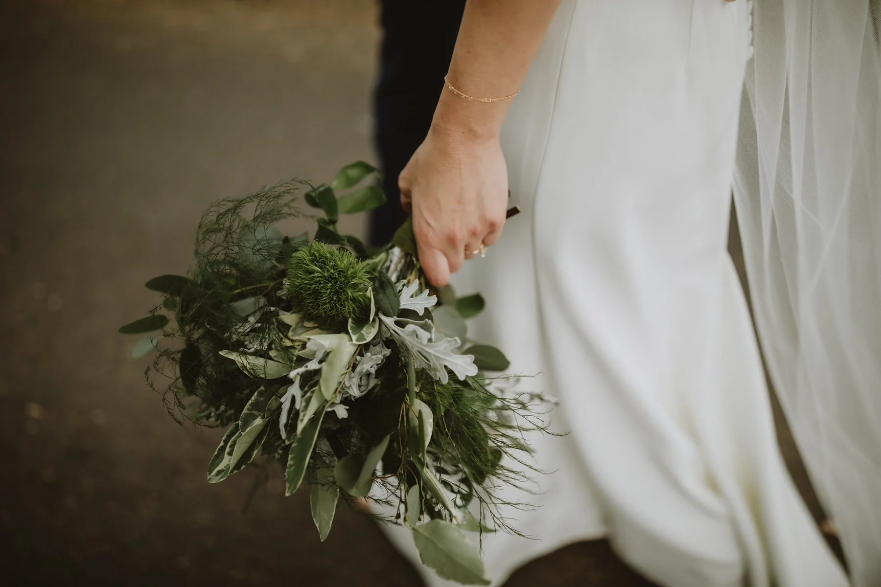 This bridal bouquet is composed of a collection of lush textural foliage and the occasional unique bloom.